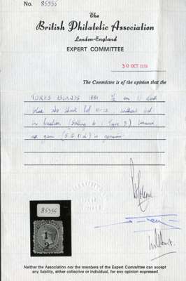 1881 ‘½’ (setting 6, type 6) on 1s dull blue, without bar in fraction, unused without gum. Fresh appearance, a very collectable example of this scarce stamp. BPA Certificate (1978). SG 11d