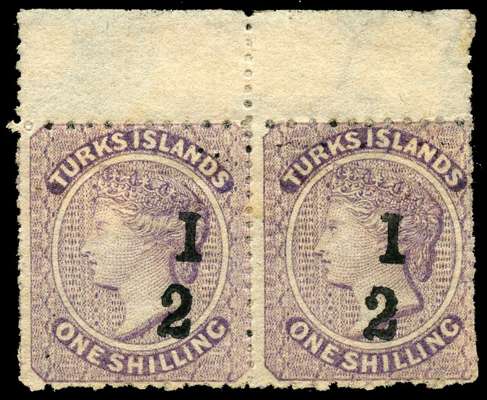 Turks Islands 1881 ½ on 1s lilac type 4 surcharge without bar pair