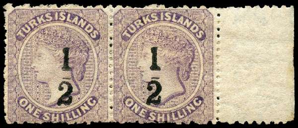 Turks Islands 1881 ½ on 1s lilac type 5 surcharge horizontal pair
