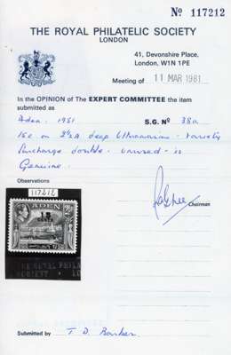 1951 15c on 2½a deep ultramarine surcharge double RPS certificate (1981), fine and scarce o.g. SG 38a