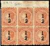 1881 ‘½’ (setting 8, type 7) on 1d dull red, top marginal block of six (3x2), large part og