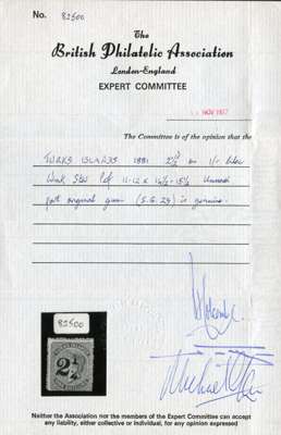 1881 (1 Jan) ‘2½’ on 1s lilac, type 19 surcharge, large part o.g., straight edge at foot still a fine example of this very scarce stamp. BPA cert (1977). SG 29, cat £650