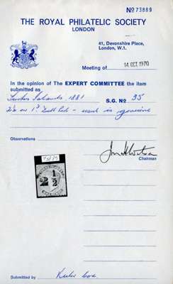 1881 ‘2½’ (setting 8, type 24) on 1d dull red, large part o.g., perfs trimmed at left and top. Fair. RPS Certificate (1970). SG 35