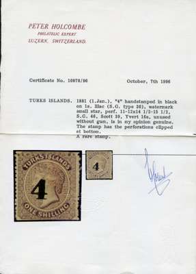 1881 (1 Jan) ‘4’ on 1s lilac, type 30 surcharge, unused, clipped perfs at foot still much above average for this very rare stamp. Holcombe cert (1996). SG 46, cat £3000