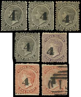 1881 (1 Jan) ‘4’ local surcharges, very useful selection comprising 6d black (3 - types 28, 29 (2) and 30), 1s lilac type 29, and 1d dull red type 29, typical mixed condition, unused to large part o.g., also 1d dull red type 29 used. SG 42/45, 47, cat £3405