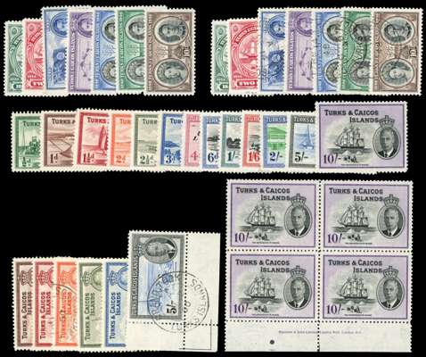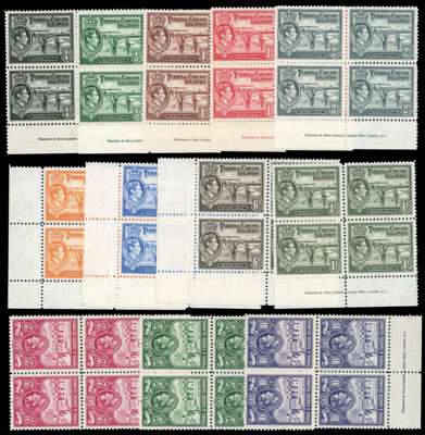 1938-45 set of twelve to 10s, all in marginal imprint blocks of four (except 2½d, 3d and 6d corner marginal only), unmounted o.g. Also mint and used selection of later KGVI issues with 1950 10s imprint block of four. Mostly fine