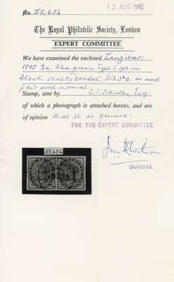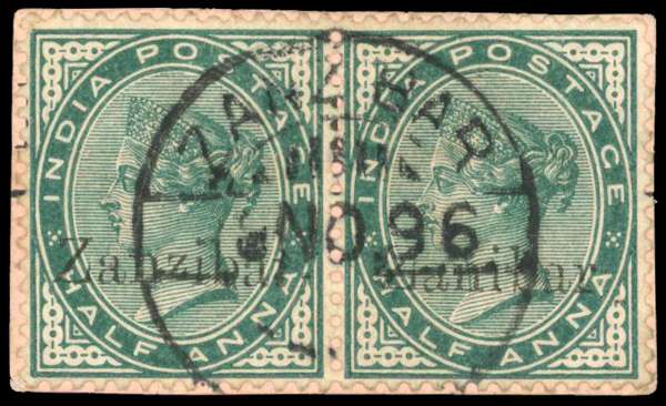 1895-96 ½a blue green, black opt, horizontal pair, the left stamp with small second ‘z’, the right showing ERROR ‘Zanibar' (R.7/2 July 1896) used on piece, tied by neat central strike from cds for 18 NOV 96, very fine and rare. One of only four used examples recorded by us. RPSL Certificate (1965) SG 3/k £1700