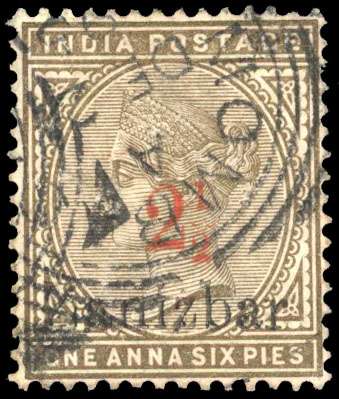 1895 ‘2½’ on 1a6p sepia, surcharge type 2 in red, showing ERROR ‘Zanizbar’ (R.1/9) neatly cancelled in transit by part Mombasa squared circles for DE 21, small thin at upper right, still of fine appearance and above average for this rarity. Being one of just ten examples recorded by us in private hands (with one in the Royal Collection). SG 22k £1900