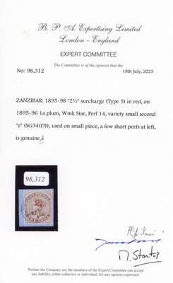 1895-96 ‘2½’ on 1a plum, surcharge type 5, small second ‘z’ used on small piece tied by part cds, few nibbled perfs at left, otherwise fine and scarce. BPA Certificate (2023) SG 34D £850