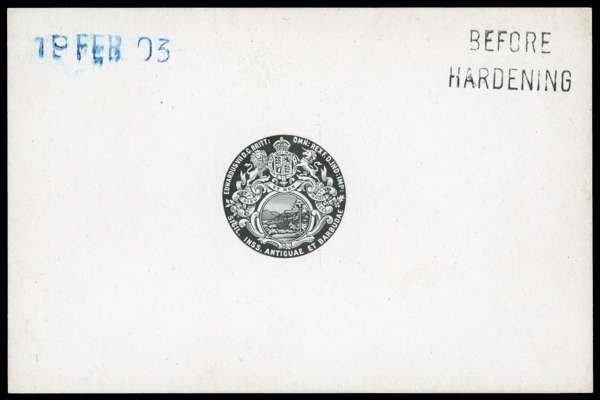 1902 De La Rue master die proof for the badge vignette, in black on glazed white card, endorsed "BEFORE/HARDENING" in black and dated “19 FEB 03” in blue. Fine and scarce.
