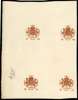 Almanack Duty Revenue: 1804 1s chestnut, proof impression on laid paper block of four (Dies 101/2 and 110/4) from the upper left of the sheet, endorsed 1804 in manuscript at lower right. Fresh and fine and a scarce multiple. Booth 131