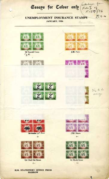 1936 (January) series of ten revenue colour trials on Stationery office headed card (240mm x 337mm) titled ‘Essays for Colour only’, each denominated 8/1/½d with apparently unrecorded ‘AGRICULTURE’ overprint at foot in red, the proposed ‘3d umber’ deleted by gumming issued 1s6d red & black directly to the page over the block and ‘3d umber’ amended in manuscript to ‘4d red’. an additional sheet gummed by left margin bearing a further imperforate block denominated ‘2d’ with the issued ‘AGRICULTURE’ overprint on unemployment with black value tablets (as Booth 1), although the 2d an unrecorded value. A unique and exceptional archival record, of stamps which may well have been issued but are unrecorded by Booth. A super lot.