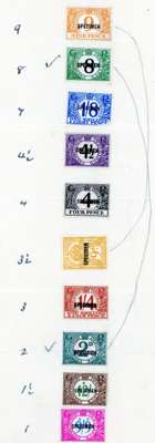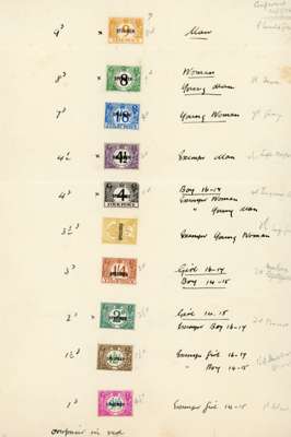1936 archive sheet (230mm x 325mm) on embossed Stationery office paper, bearing nine ‘unemployment insurance’ revenues and one ‘Health & Pensions’ revenue, each handstamped with block ‘SPECIMEN’ overprint, each stamp applied as a basis for colour to select the schemes for the following years. Annotations in two columns on the right include rates e.g. ‘Exempt Man’, ‘Girl 16-17’, and in the right column, headed ‘selected at conference 14/3/36' the final shade of each colour e.g. ‘8d fawn’. Offered with accompanying sheet (190mm x 240mm) bearing the same stamps with further arrows and annotations. Some toning and crease through 2d green, nevertheless a unique archival record with much scope for further study. An important piece of the giant jigsaw that these issues represent!
