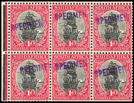1926-27 typographed 1d, Pretoria printing, perf 13½x14, booklet pane of 6 (inverted watermark), each with violet 'SPECIMEN’ h/s (Samuel type SA4), perfs trimmed at foot otherwise fine and fresh large part o.g., attractive and very scarce. SG 31e var