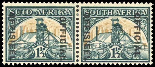 OFFICIAL: 1944-50 1½d blue-green and yellow-buff bilingual pair variety diaeresis over last ’E' of ‘OFFISEEL’. Fine large part og. SG O33a