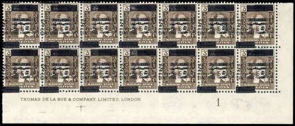 SOUTH ARABIAN FED: 1965 5f on 5c sepia with surcharge quadruple, one inverted in lower right hand corner block of 14 (7x2)