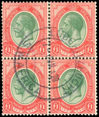 South Africa used in. 1913-24 £1 green and red, block of 4, centrally cancelled by ‘LUDERITZBUCHT / S. W. AFRICA’ cds, dated ‘1 JUN 20’, minor perf separation at top and tiny traces of toning on reverse otherwise fine and rare. SG Z16, cat £3000