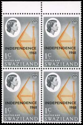 SWAZILAND: 1968 1c Battle Axe, top marginal block of 4, watermark inverted, fine unmounted o.g. SG 143w