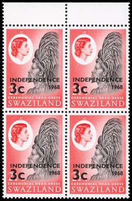 SWAZILAND: 1968 3c on 2½c Headdress, top marginal block of 4, watermark inverted, fine unmounted o.g. SG 146w
