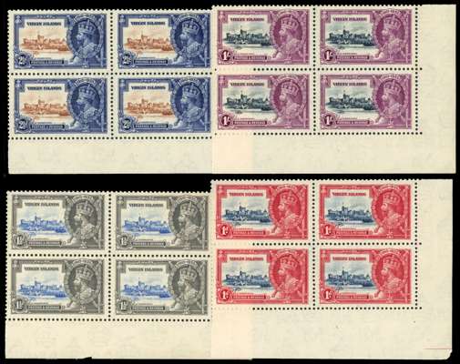 1935 Silver Jubilee set in lower right corner blocks of four, each with Plate ‘2B’ R10/6 kite and horizontal log. The stamps unmounted o.g., the gum lightly toned, the 1½a block with some light patchy foxing on reverse; good appearance and a scarce matched set. SG 103l-106l, £1005