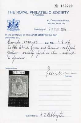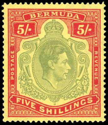 BERMUDA: 1943 5s. pale bluish green and carmine-red on pale yellow, R2/5 ‘gash in chin’ variety, with RPS certificate