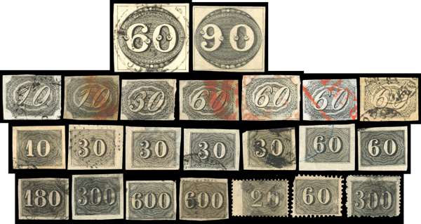 1843-66 mainly used selection arranged on a Hagner sheet including 1843 ‘Bull’s Eye' 60r, good margins, 90r, unused without gum, close to good margins, 1844-46 ‘Goat’s Eye' 10r (2), 30r, 60r (4), 1850 ‘Numerals’ 10r, 30r (4), 60r (2), 180r, 300r (2), 600r (2), 1866 perforated types values to 300r. Condition very mixed with some good to fine. (23)