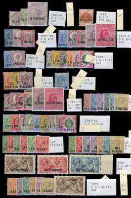 Mint on stock card including 1885 to 12pi on 2s6d, 1887 to 4pi on 10d, 1893 40pa on ½d (used), 1902 to 24pi on 5s, 1905-08 1pi on 2½d and 2pi on 5d, 1909 to 5pi on 1s, 1911 to 24pi on 5s, 1913 to 5pi on 1s, Levant 1905 to 1d, 1921 to 18¾pi, 1921 seahorses to 180pi on 10s, British Currency 1921 to 2s6d, mainly fine. (68) SG 1/L24