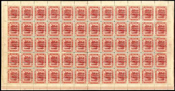 1922 Malaya-Borneo Exhibition 3c scarlet complete sheet of sixty, thirty normals plus ten each of the varieties. Toned o.g. with darker areas, interleaving adherence mostly affecting the outer stamps. SG 53-c, £1020