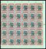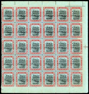 1922 Malaya-Borneo Exhibition $1 black and red on blue paper right half-sheet of thirty, fifteen normals plus five each of the varieties. Toned o.g. with darker areas, interleaving adherence mostly affecting the outer stamps. SG 59-c, £3150