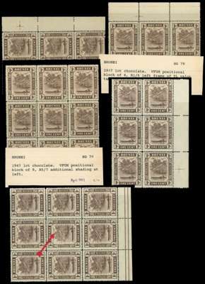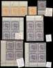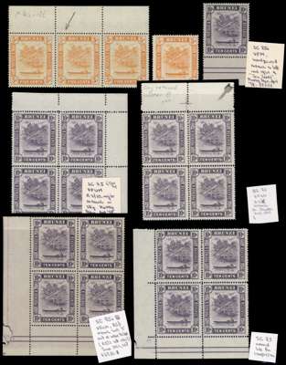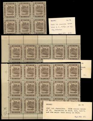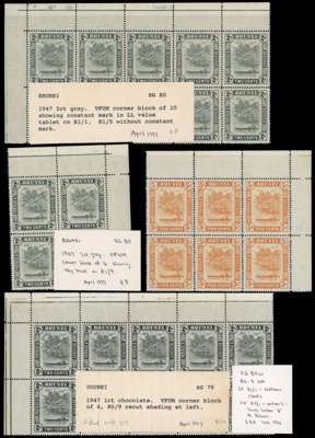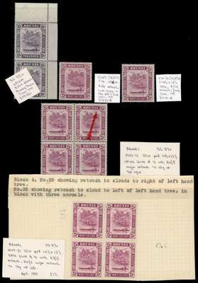 1947-51 varieties mostly in blocks, mint, mainly unmounted o.g. but mostly lightly toned. 1c blocks (8), 2c grey (2). 2c black corner block of ten with SG 80ac; 5c perf 14 block and single with R1/8 ‘5c’ retouch, perf 14½ x 13½ strip; 10c six blocks, pair and single, including major retouches; 25c block (lightly hinged) with R4/5 redrawn clouds, further block with R4/8 major retouch and two singles. SG 79/87b