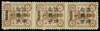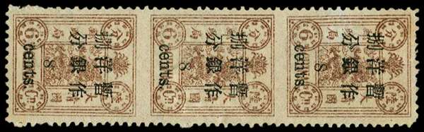 1897 (Jan) Small figure surch on Dowager Empress, 8c on 6ca brown, vert strip of 3, error imperf between (Chan 42e), top stamp a trace of gum thinning, large part o.g., very rare