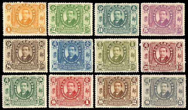 1912 Commemorating the Revolution, Sun Yat-sen set of twelve to $5 slate, large part o.g. odd imperfections, 20c with small paper adhesion, otherwise fine, above average condition for this set. SG 242-253