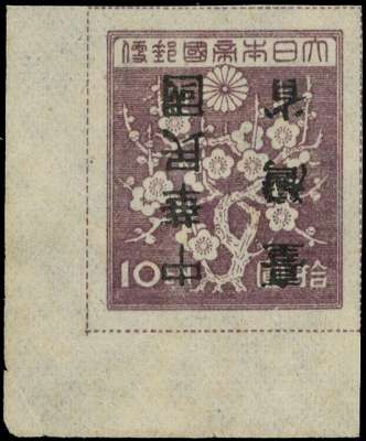 Taiwan: 1945 10y purple ‘Plum Tree’, lower left corner example showing ERROR OVERPRINT INVERTED, small central paper wrinkle, otherwise fine and scarce. SG 9a