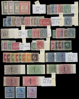 1892 to 1926 range on stock card including 1892 to 10d, 1893 to 10d, 1893 to 1s (2), 1901 1d brown, 1902 to 1s, 1921-23 to £1, 1926 2s (both) and 3s. Mainly good to fine. (63) SG 1/92