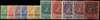 1912-20 set of eleven to £1 overprinted SPECIMEN Type D12 or 12a, mint, part to large part o.g. Minor blemishes as almost always (10/- with hinge remainder, £1 with gum creasing), some adhesions possibly of archival origin. 396 sets possible, very difficult to assemble as a result of the later distribution of the 5/- reddish maroon, 10/- and £1. SG 60s/69s, £1,900.