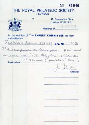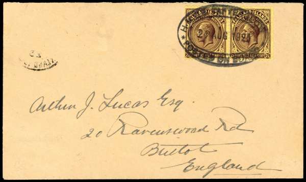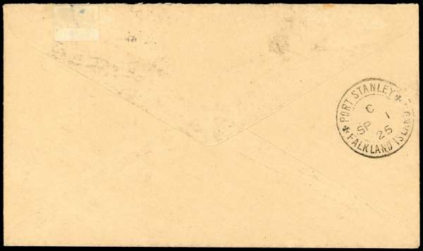 1925 (24 AUG) cover to Bristol UK bearing 1921-25 2½d deep purple/pale yellow, horizontal pair, with fine complete strike of "H.M.C.S. AFTERGLOW / POSTED ON BOARD" oval ship ds in black, with Port Stanley transit cds (1 SP) on reverse. An attractive cover, the 2½d scarce with this cancel. Heijtz SC5. S.G. 77