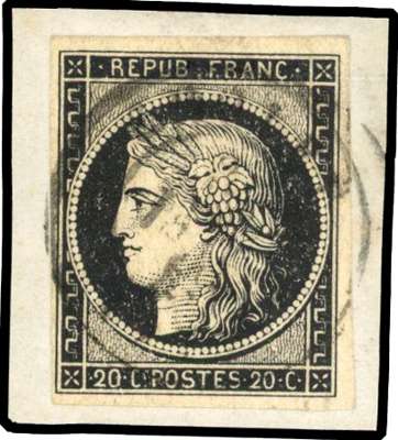 France 1849 20c black on white paper tied to small piece by scarce cds cancel, fine used SG 7