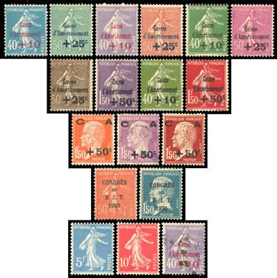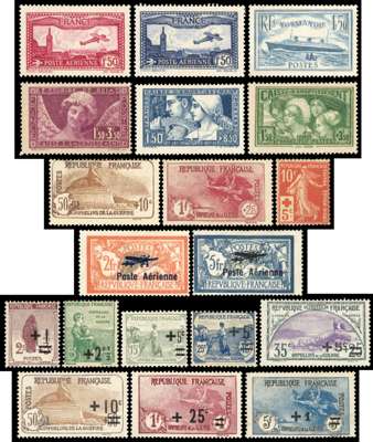 1914-36 mainly mint selection arranged on a Hagner sheet including 1922 War Orphans' Fund surcharges to +1f on 5f+5f surcharges 1927 Air 2f, 5f overprints, Sinking Fund 1928 1f50+8f50, 1930 1f50+3f50, 1931 1f50+8f50. Condition variable. (37)