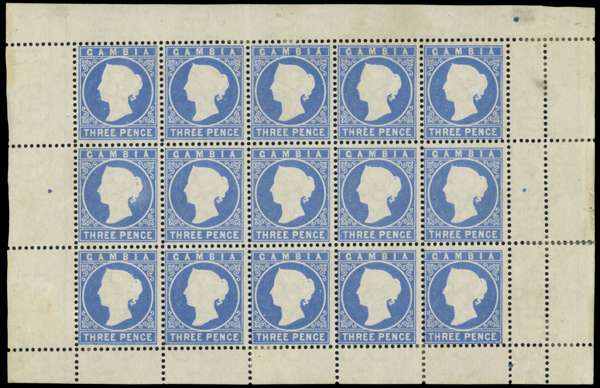 1880-81 3d pale dull ultramarine, wmk CC, comb perf from May 1881 printing, complete sheet of 15 (5x3), large part o.g. (5 stamps unmounted). Odd small fault mainly in margins, R1/1 tiny thin and yellowish gum, still an attractive piece, one of only 915 sheets printed, SG 14cB