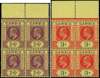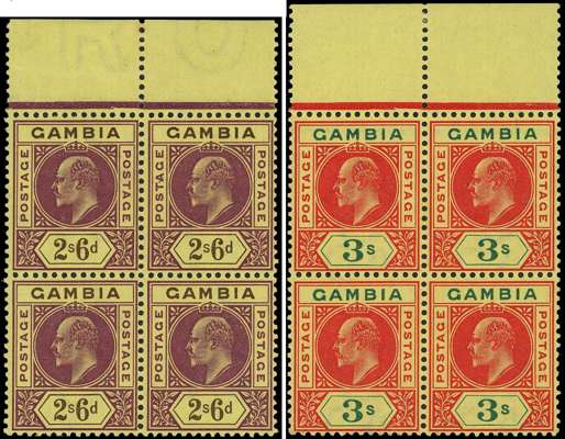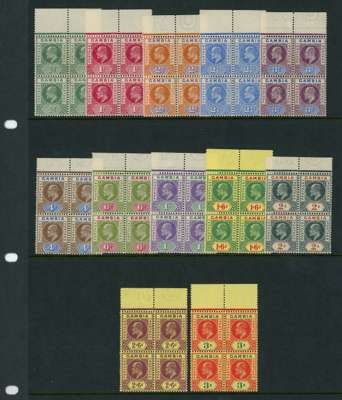 1902-05 Wmk CA set of 12 to 3s, in matching upper marginal blocks of 4 from left pane R1-2/2-4, with distinctive 'notch' in jubilee line above R1/3, and showing variety 'slotted frame' on upper right stamp (R1/4), o.g. (lower pairs unmounted). Some values with small gum stains from hingeing, but very fine appearance with fresh colours. An extraordinary and unrepeatable set of matched positional blocks with this variety, which is very clear on the original 1902 values to 1s and 2s, but detectable only under magnification on the 1905 1s6d, 2s6d, 3s, perhaps as a result of a repair to the plate. Only 50 sheets each printed of the 1s and 2s, 98 sheets of 4d, 100 sheets of 6d. SG 45-56