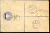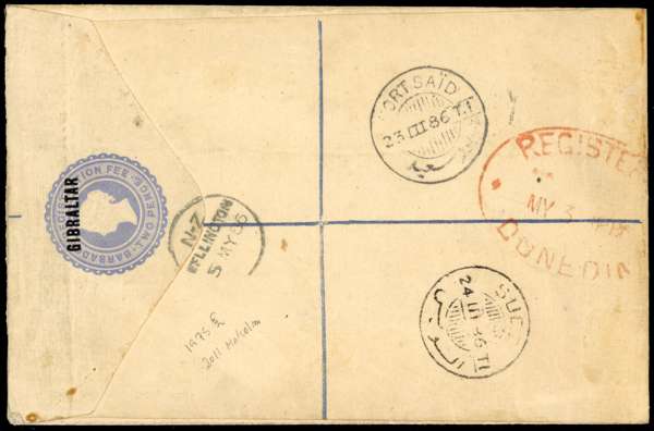 1886 (15 MR) opt on Barbados 2d registered p/s envelope, size G, endorsed ‘pr P+O Mail’ and addressed to ‘The Secretary of the Standard Marine Insce Coy of New Zealand', uprated with 1886 opt on Bermuda 4d orange-brown vertical pair, tied by single registered oval ds with further strike alongside and sender's cachet at lower left, backstamped at Port Said (23 Mar), Suez (24 Mar), Dunedin (MY 3) and Wellington (5 MY); slight imperfections, nonetheless an exceptionally rare combination of franking and destination. SG 5