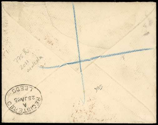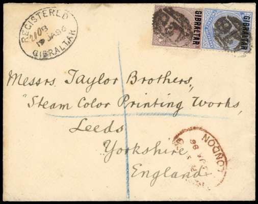 1886 (19 JA) registered cover to Leeds, franked by 1886 opt on Bermuda 2d brown-purple (corner defect) and 2½d ultramarine, each cancelled by ‘A26’ numeral with registered oval at upper left, London registered oval (24 JA) at lower right and backstamped at Leeds (25 JA); a fine and attractive usage. SG 3, 4