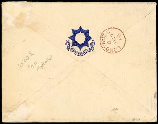 1886 (JY 13) soldier's envelope (embossed regimental logo on flap) to London, Bernardy correspondence, endorsed “From A.N.J. Major 1st East York Regt” and countersigned by the Commanding Officer at lower left, franked by 1886 opt on Bermuda 1d rose-red, tied by ‘A26’ duplex with London arrival (JY 17) cds on reverse; a fine and extremely rare first issue concessionary rate franking. SG 2
