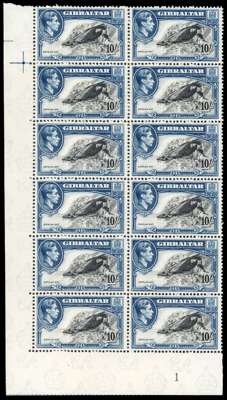 1943-51 10/- perf 13 lower left corner block of twelve (R5-10/1-2) with Vignette Plate 1, fine unmounted o.g. SG 130a, £540