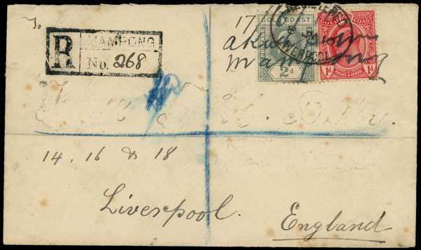 POSTAL HISTORY: Registered cover with manuscript "17/6/10, Akwapim, Mampong" cancelling a 1908 1d and a 1909 2d, boxed registration mark of Mampong alongside. Transit mark of Dodowah (20 JU 1910) on reverse. Liverpool arrival cancel ties the stamps and applied on reverse as well. Part of address erased. Ex Ashanti, an early example of a rare cancel, of which only a handful are recorded on cover