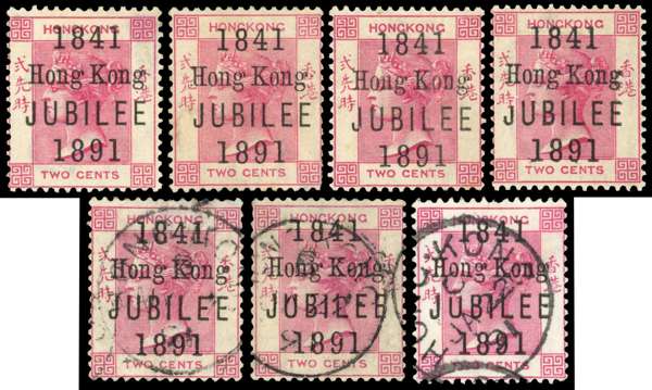 HONG KONG: 1891 2c carmine Jubilee overprint, 4 mint examples including 1 with short ‘J’ in ‘JUBILEE’ and 3 used examples