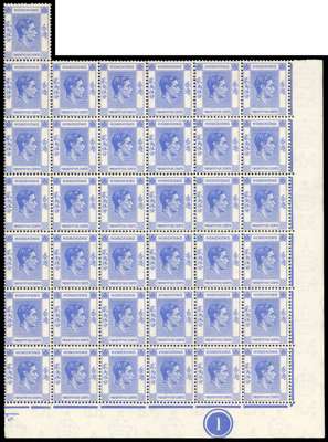 1938-46 25c bright blue lower six rows of right pane with one additional stamp at top, fine unmounted o.g. with some minor wrinkles and the single stamp with a short perf. R9/3 shows the single variety recorded by Halewood and Antscherl on this value, a framebreak above the ‘G’ of KONG. SG 149, £1073
