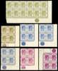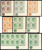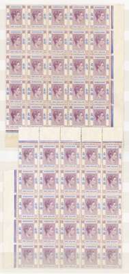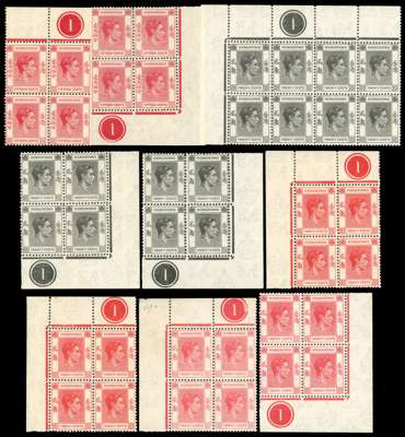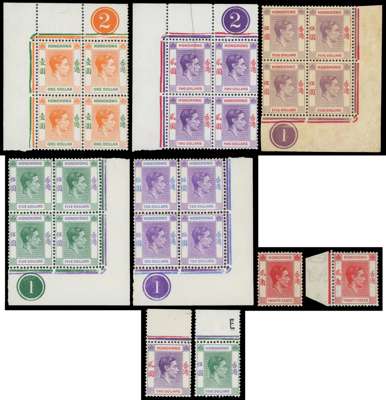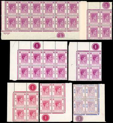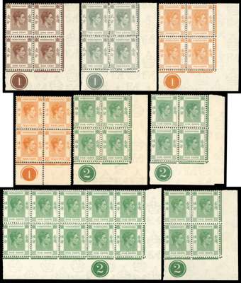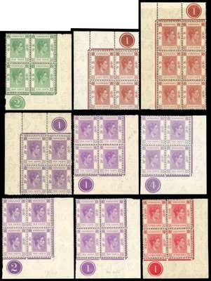 1938-52 mint multiples, nearly all Plate blocks, unmounted o.g. 1c, 2c, 4c (2), 5c (5), 8c (2), 10c (5), 15c (3), 20c black (2), 20c red (3), 20c rose-red, 25c blue (2, one a block of ten with Req. Z), 25c yellow-olive two blocks of ten and block of four, 30c yellow-olive perf 15 x 14, 30c blue (3), 50c perf 14 (2), perf 15 x 14 (4, one a block of ten), 80c (2), $1 lilac ordinary paper, $1 orange chalky paper (tiny foxed spot affects 2), $2 purple chalky paper, first $5 brown gum, $5 green and violet, and $10 lilac and blue (slightly toned gum). Also 20c scarlet block of 20 and two blocks of 25 of the first $1, showing the two positions of the short ‘R’, brown gum. A very good group. SG 140/162