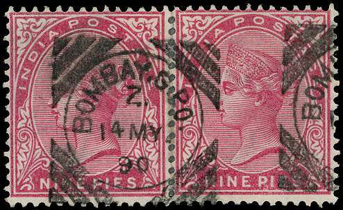 1882-90 9p aniline carmine, rejoined horizontal pair showing variety WATERMARK INVERTED, with one and a half complete strikes of 'BOMBAY GPO' cds dated "14 MY 90". A scarce variety we have not handled before in used condition. SG 87w, £1,100
