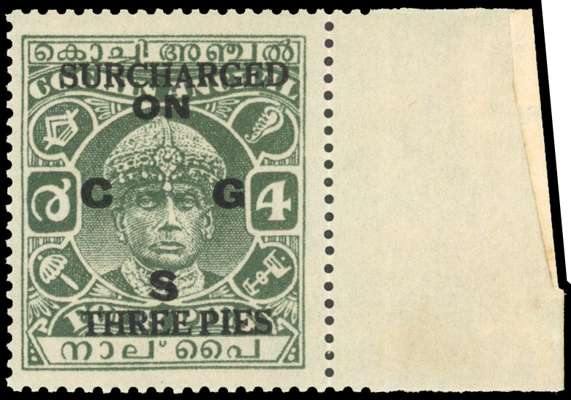 1942-43 ‘THREE PIES’ on 4p green, litho, surcharge type 20, right marginal, unmounted o.g. fine. SG O63 £400